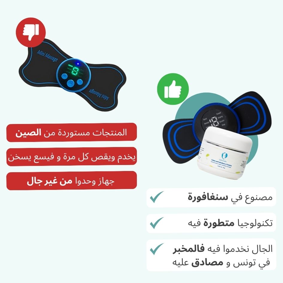 مش كيف الأجهزة الموجودة في السوق. المنتج متاعنا مجهز بتكنولوجيا متطورة وتصميم عملي ومريح يلائم استخدامك اليومي. الأهم من هذا، الجال الخاص متاعنا معمول في مخبر بجودة عالية وإحنا الوحيدين اللي نصنعوه، باش نضمنوا أفضل النتائج . المنتج متاعنا من سنغافورة، بينما الأجهزة الأخرى معظمها من الصين،